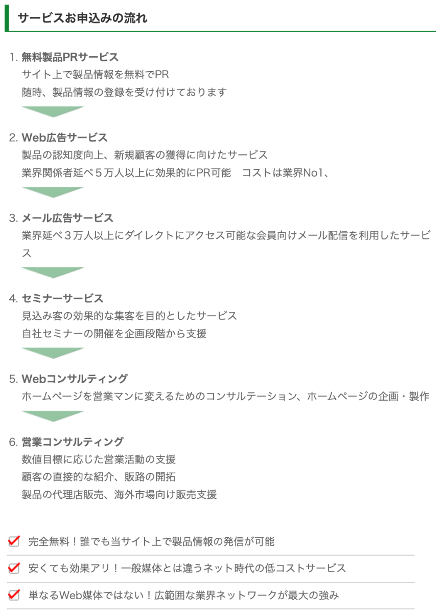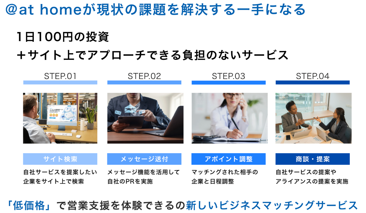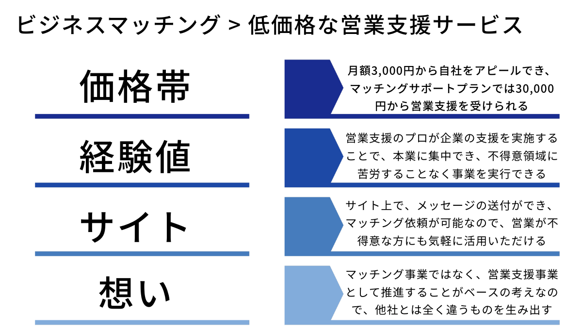 営業支援サポートがあるビジネスマッチングサイト。 営業が苦手と感じる方のサポートも実施し、低価格ではあるが、新しい営業手法として、皆様の営業支援を当社が担います。