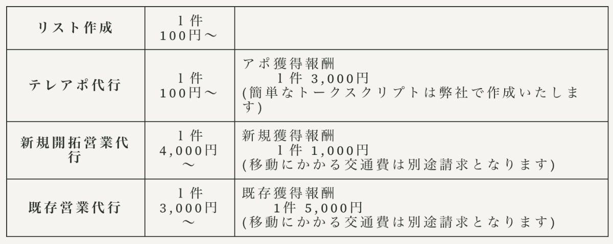 最低1件からでもお引き受けいたしますのでお気軽にご依頼ください。 単価報酬の場合、成果報酬がないところも多いですが、成果報酬がない営業はただ流すだけです。弊社は成果報酬までいただいても他社よりリーズナブルになっております。